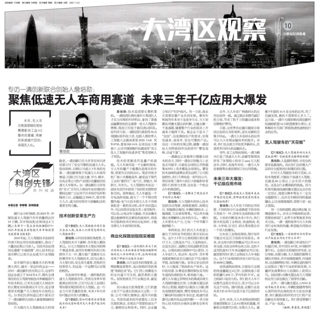 在中国科创土壤最丰沃的粤港澳大湾区,就有一家这样的企业——深圳一清创新科技有限公司,这家科创企业成立于2018年6月,拥有全球领先的自主驾驶导航技术和新能源汽车技术积淀,已率先完成无人物流车的长期复杂场景测试并交付,是全球首家实现量产无人物流车系统的公司。21世纪经济报道记者日前采访了一清创新联合创始人兼首席战略官詹培勋。