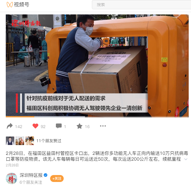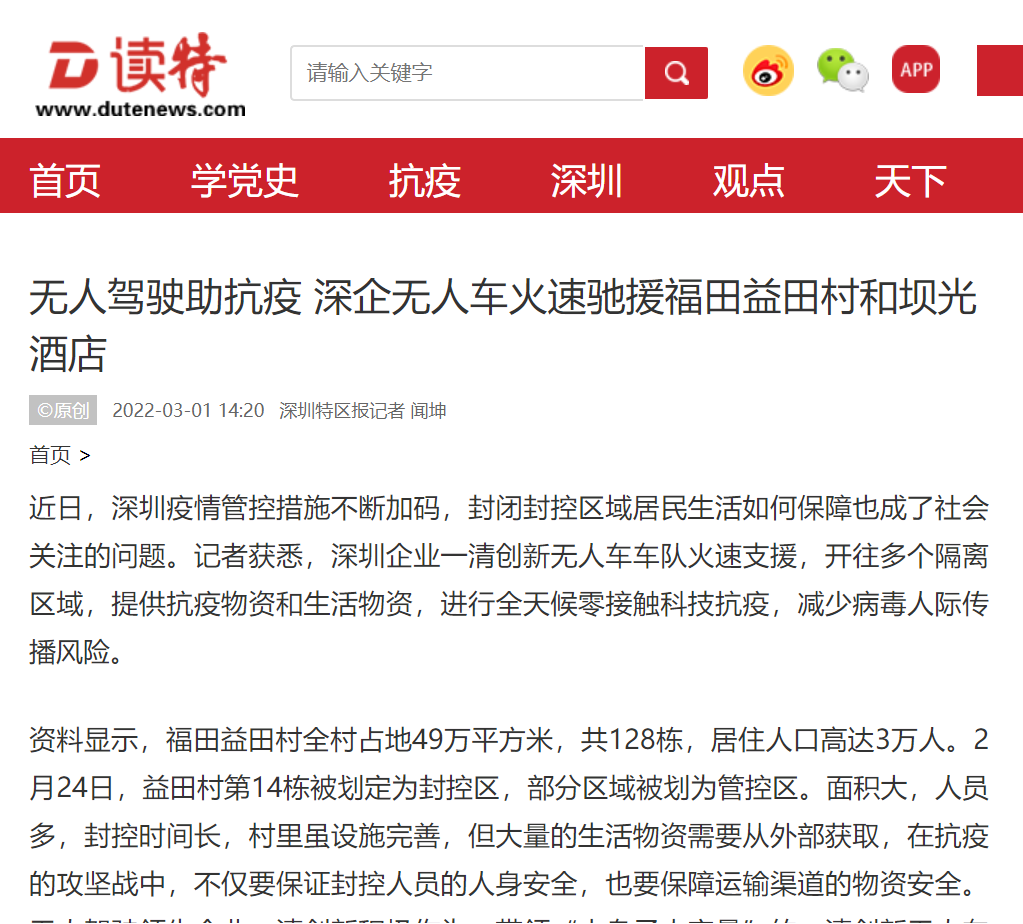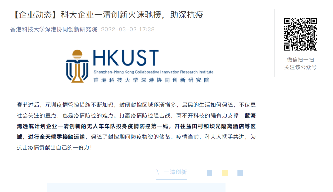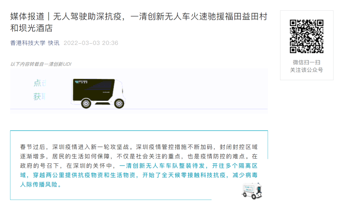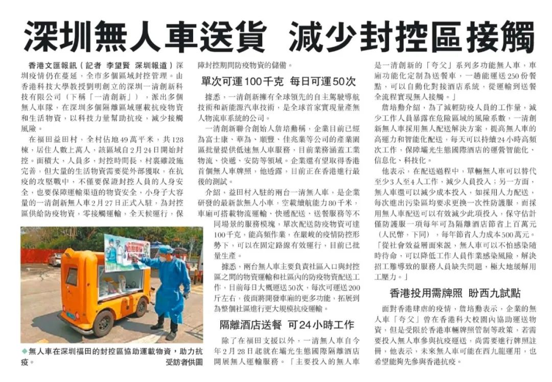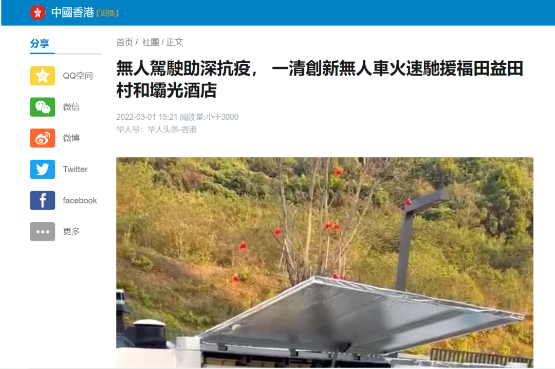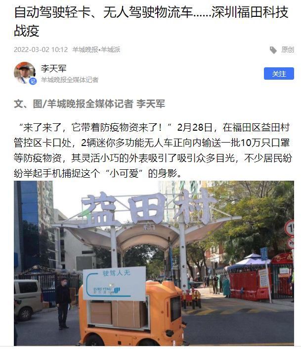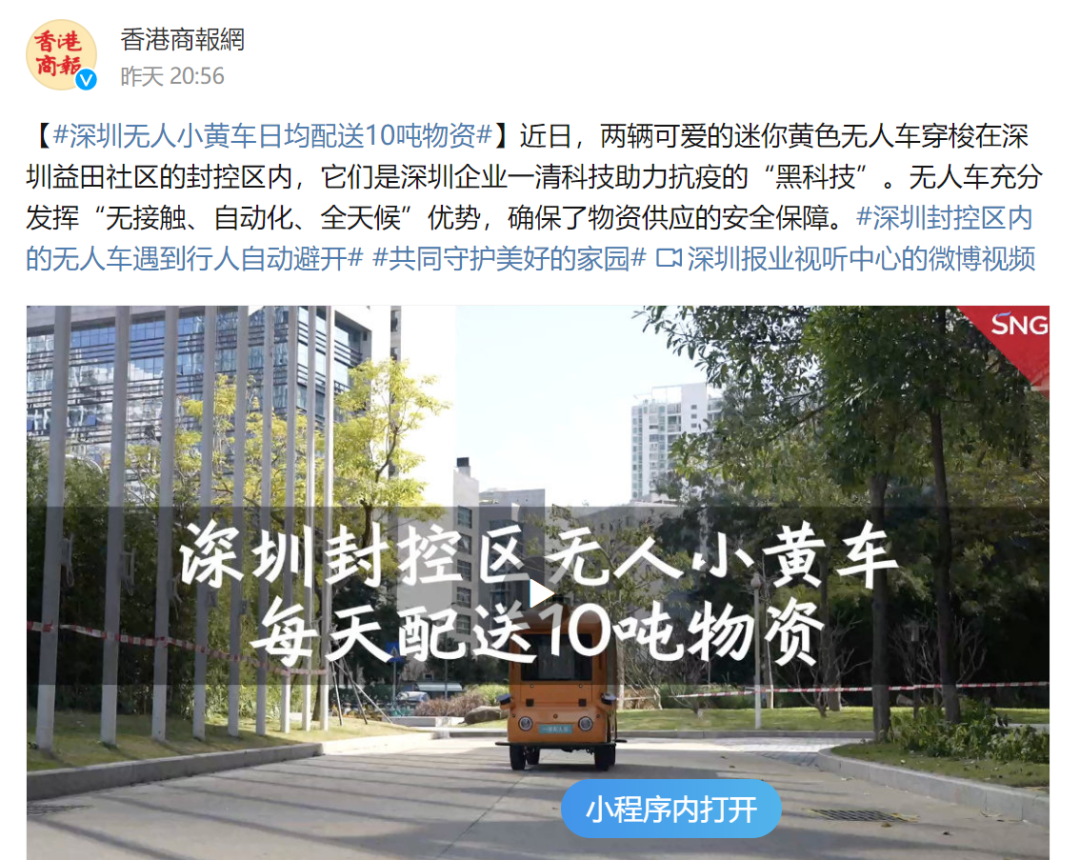 随着疫情的发酵,深圳疫情管控措施也更加严格,拥有香港科技大学背景的一清创新无人车车队在3月初火速驰援多个隔离区域,负责社区入口与封控区之间的物资运输、社区内的防疫物资配送、协助上门督促核酸检测等工作,在深圳城中村12天累计运送抗疫物资数十趟,总件数近四百件,全天候运行,减少病毒人际传播风险。