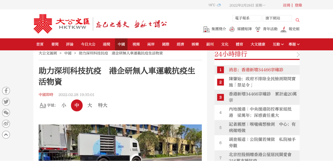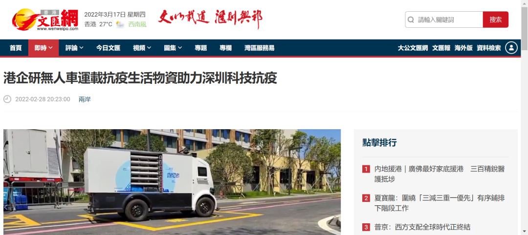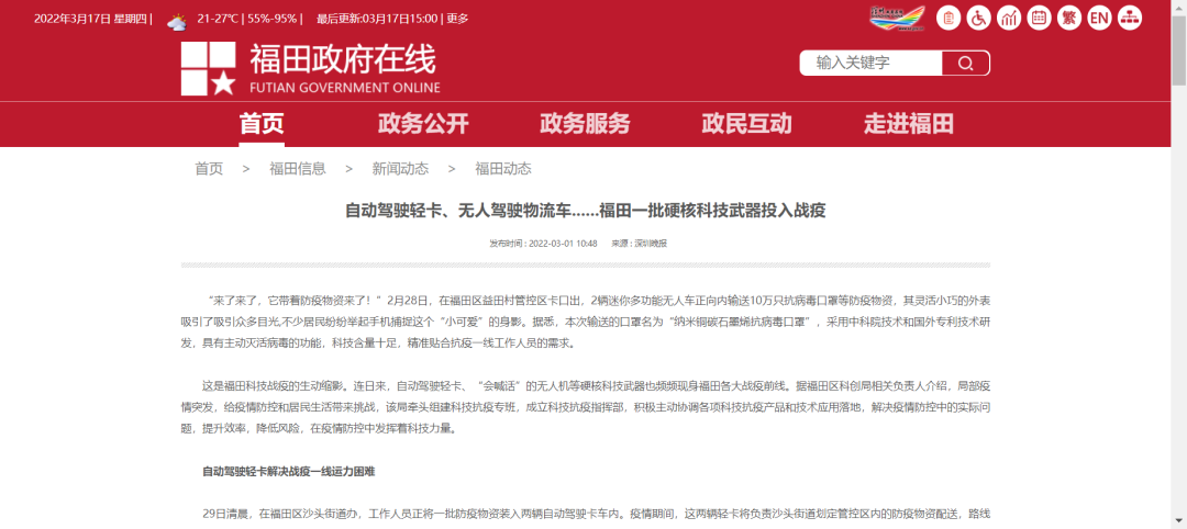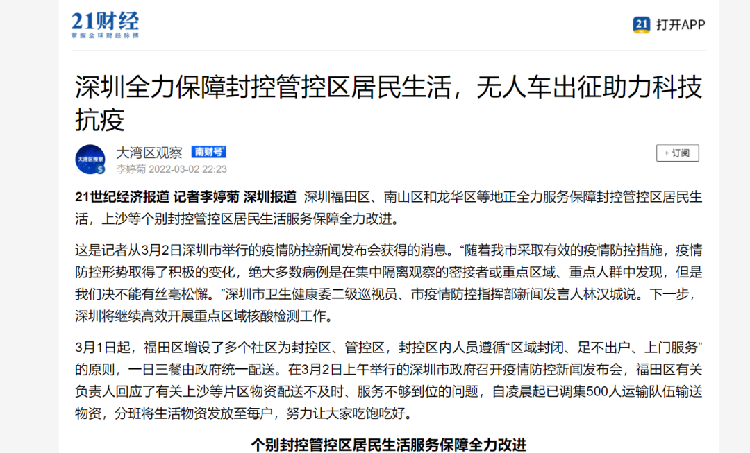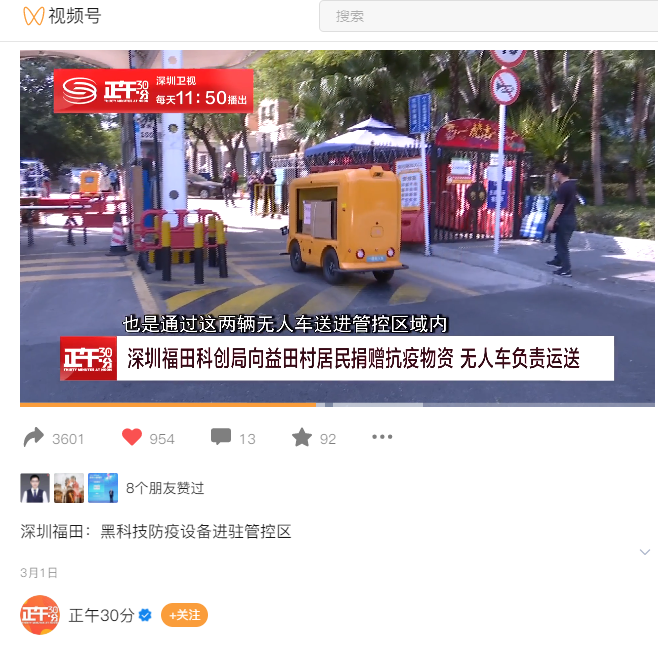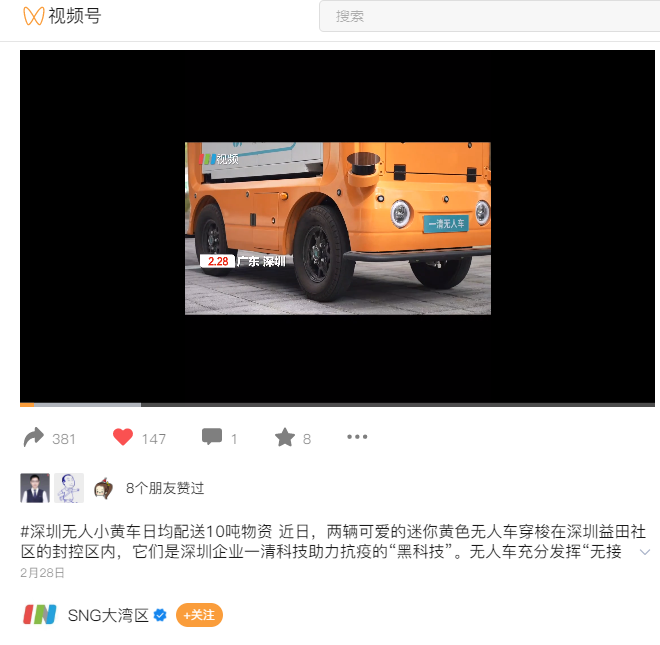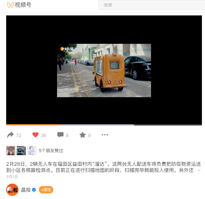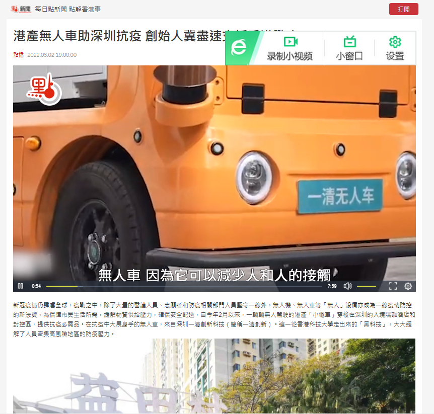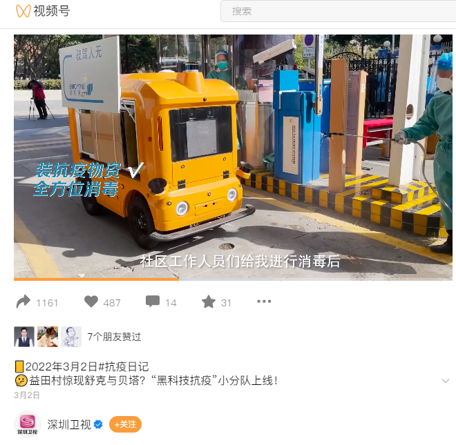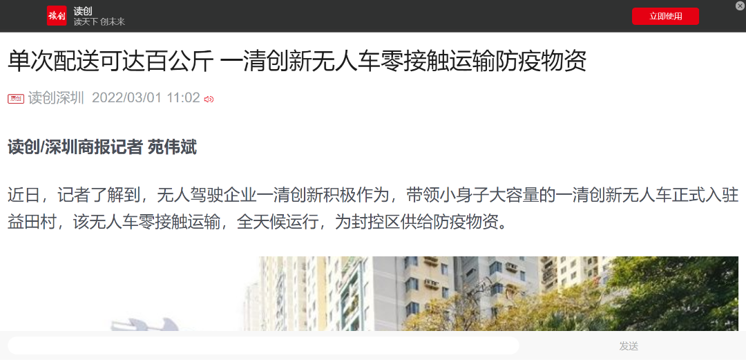 随着疫情的发酵,深圳疫情管控措施也更加严格,拥有香港科技大学背景的一清创新无人车车队在3月初火速驰援多个隔离区域,负责社区入口与封控区之间的物资运输、社区内的防疫物资配送、协助上门督促核酸检测等工作,在深圳城中村12天累计运送抗疫物资数十趟,总件数近四百件,全天候运行,减少病毒人际传播风险。