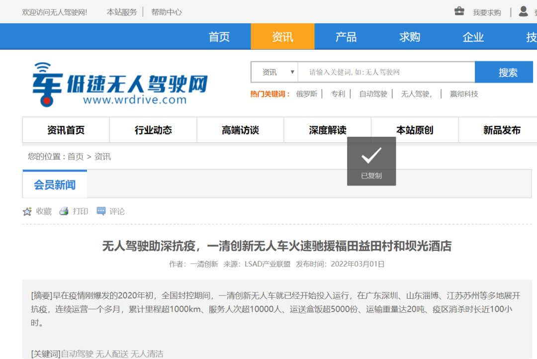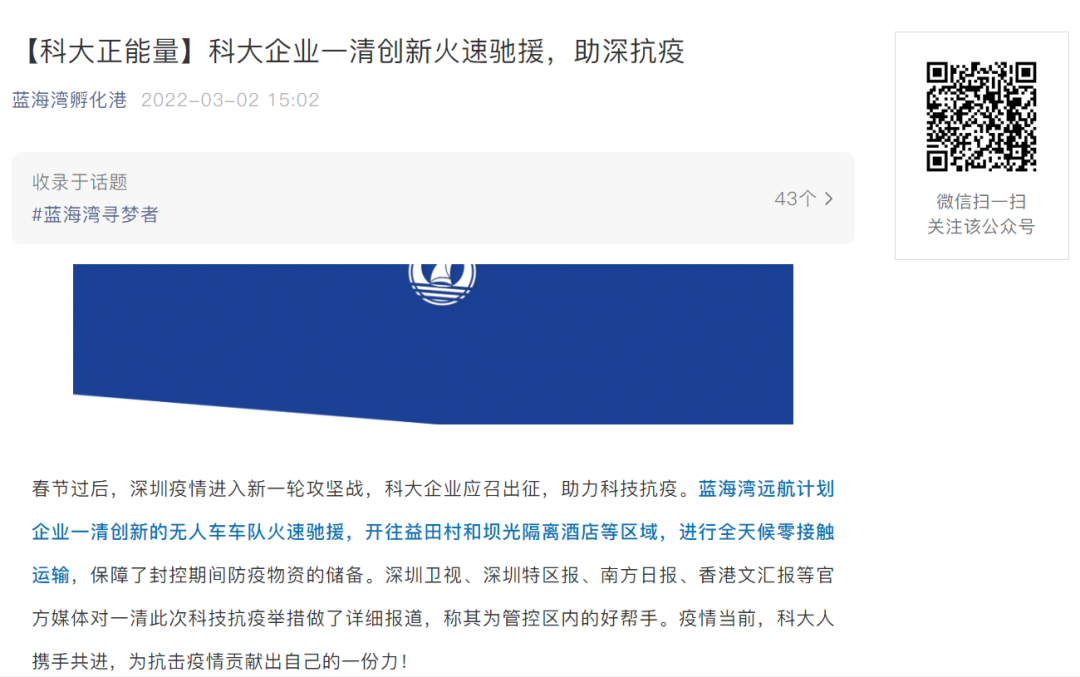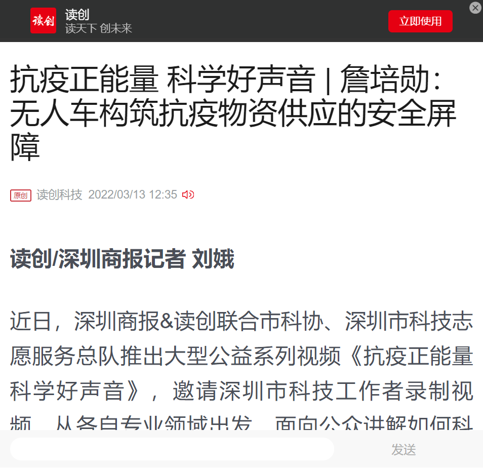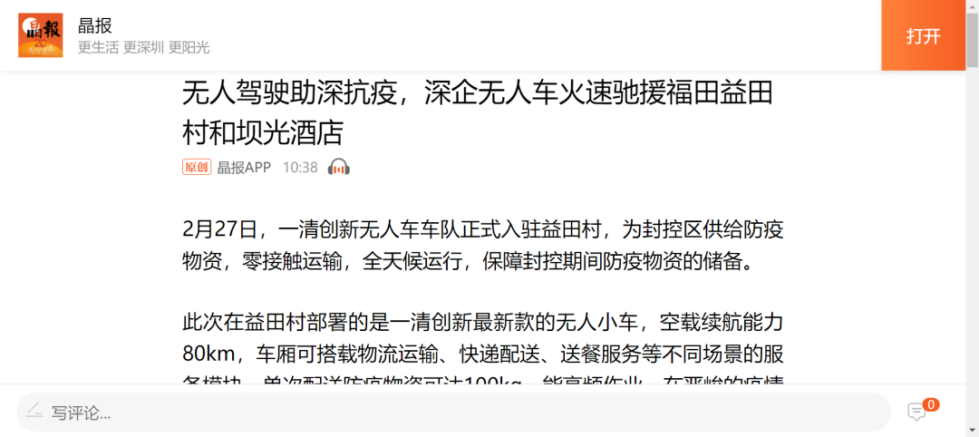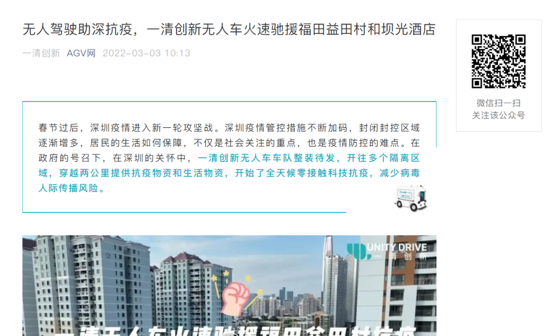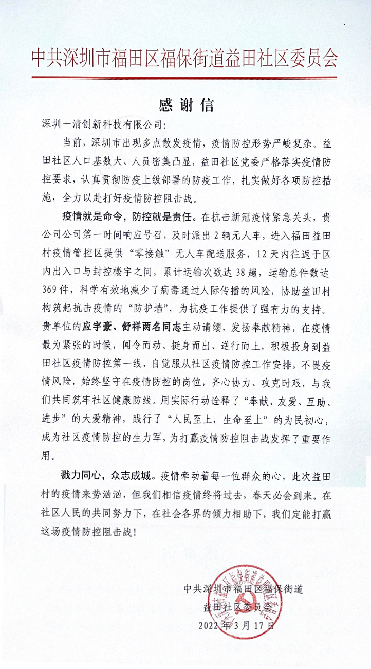 基于疫情期间一清无人车的有效运输防疫物资和一清同事们通宵达旦的积极投入抗疫工作,深圳益田村疫情防控现场管控工作指挥部还专门颁发感谢信。