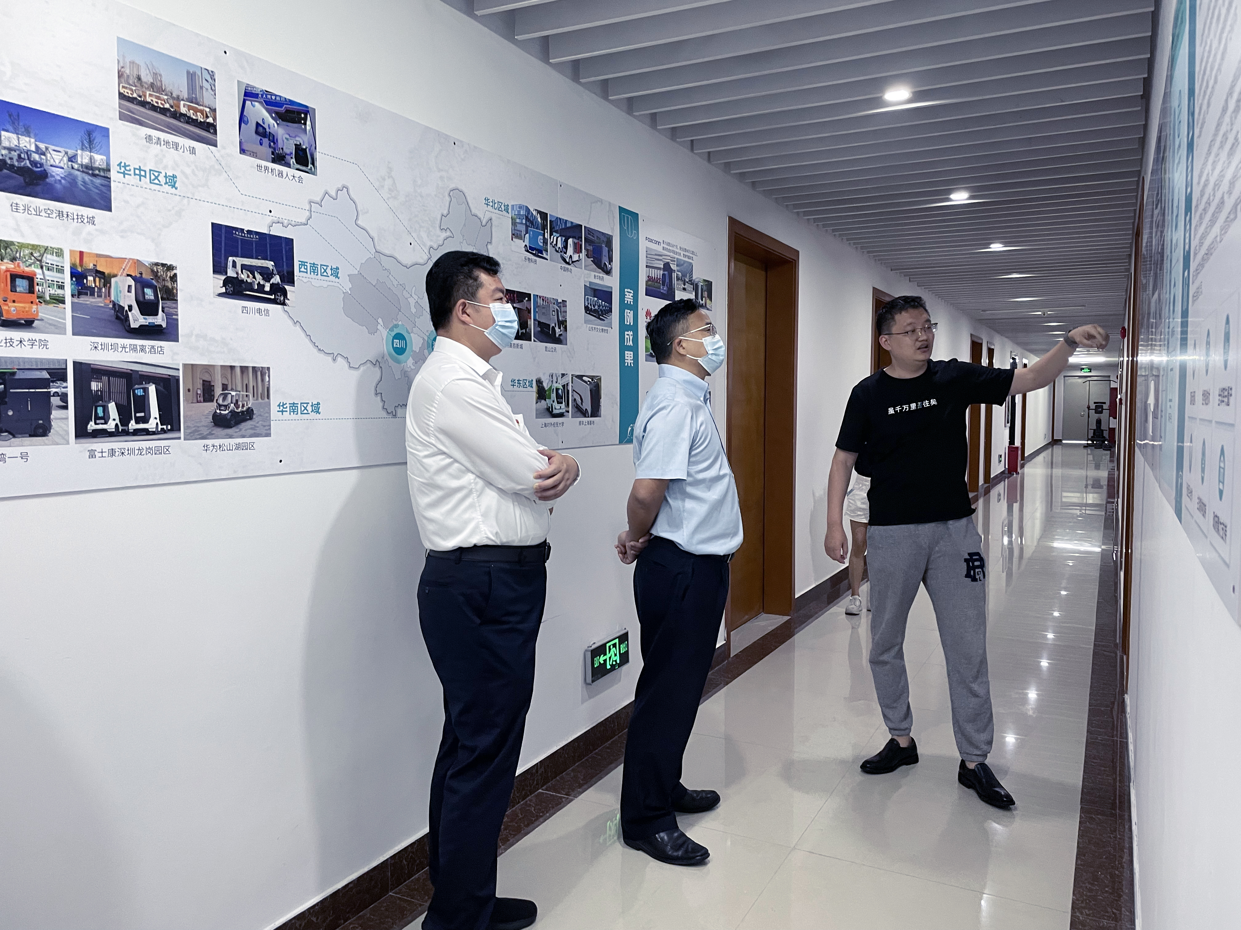 刘明教授陪同来访人员展示了一清创新自主研发的云端调度系统,实时直播了无人车的现场运行,并介绍了一清创新的发展历程、业务模式、最新成果和未来规划。王有明书记听取了刘明教授关于自动驾驶产业发展整体情况的汇报,对一清无人车的市场落地现状和在新冠疫情期间的科技抗疫服务表示了认可。