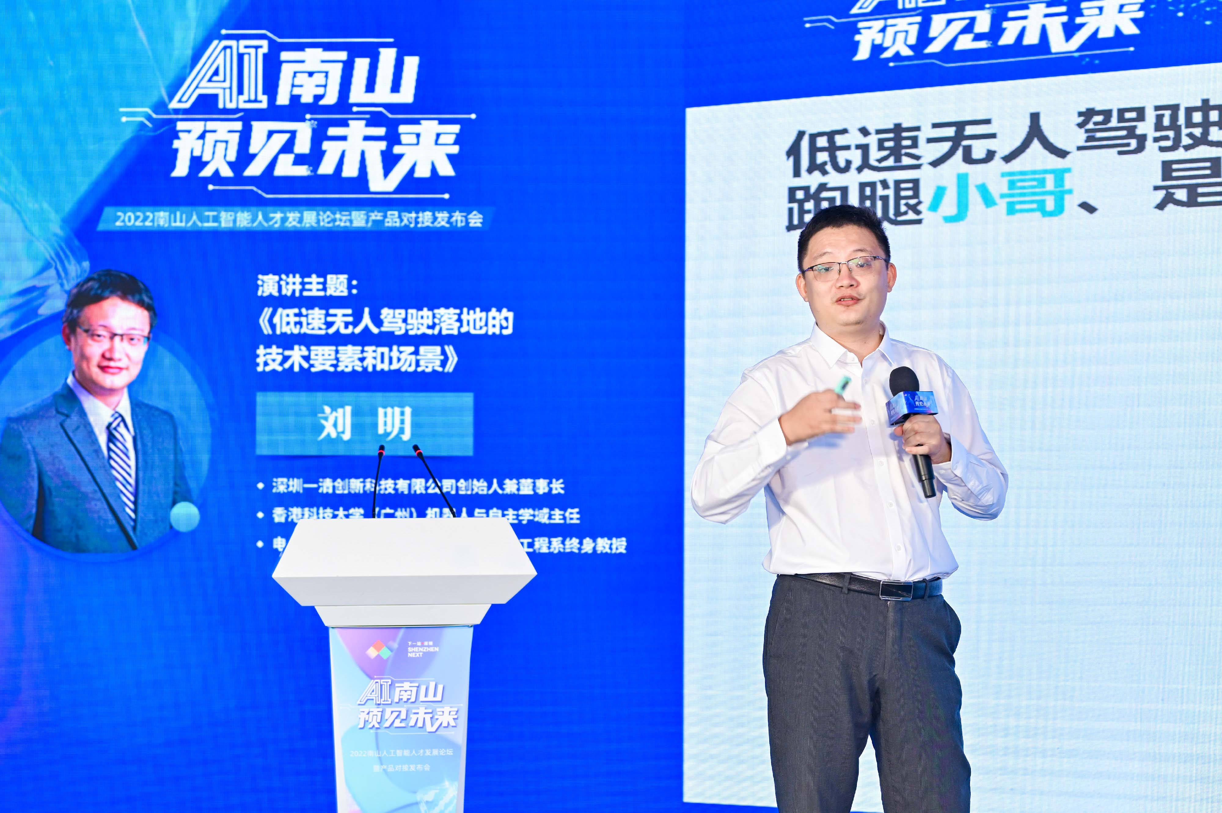 10月30日,“南山人工智能人才发展论坛”在深圳人才公园隆重举行。论坛以“AI南山 预见未来”为主题,一清创新创始人兼董事长刘明作主题演讲,畅谈低速无人驾驶的产业发展趋势,并与圆速智动(深圳)氢电商用车有限公司(下称“圆速智动”)现场签约,探索自动驾驶商用车与氢电新能源的应用产业化。